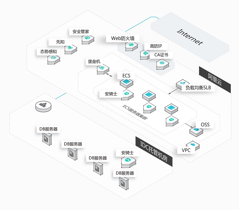 同时将全部的互联网流量都经过阿里云云盾的安全过滤,将阿里云变成IDC的弹性、可扩展、安全的云层,通过阿里云云盾强大的安全防护能力,和基于全网大数据的态势感知,整体管理混合云的安全,降低您对线下IDC安全和管理投入。