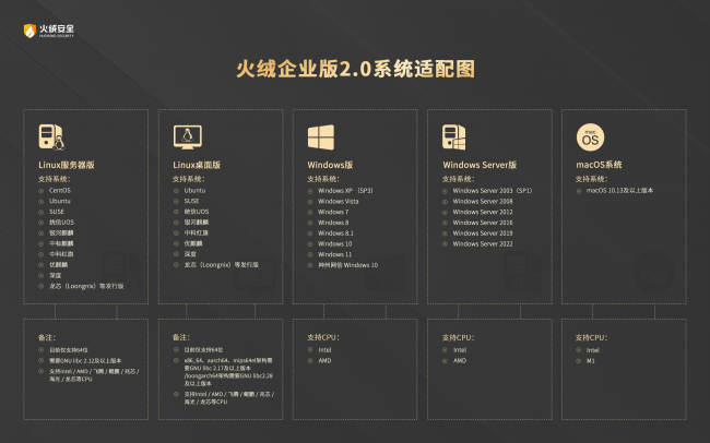 涵盖桌面与服务器版本 兼容主流国产操作系统和CPU 涵盖桌面版与服务器版两大版本,均搭载火绒自主研发的反病毒引…